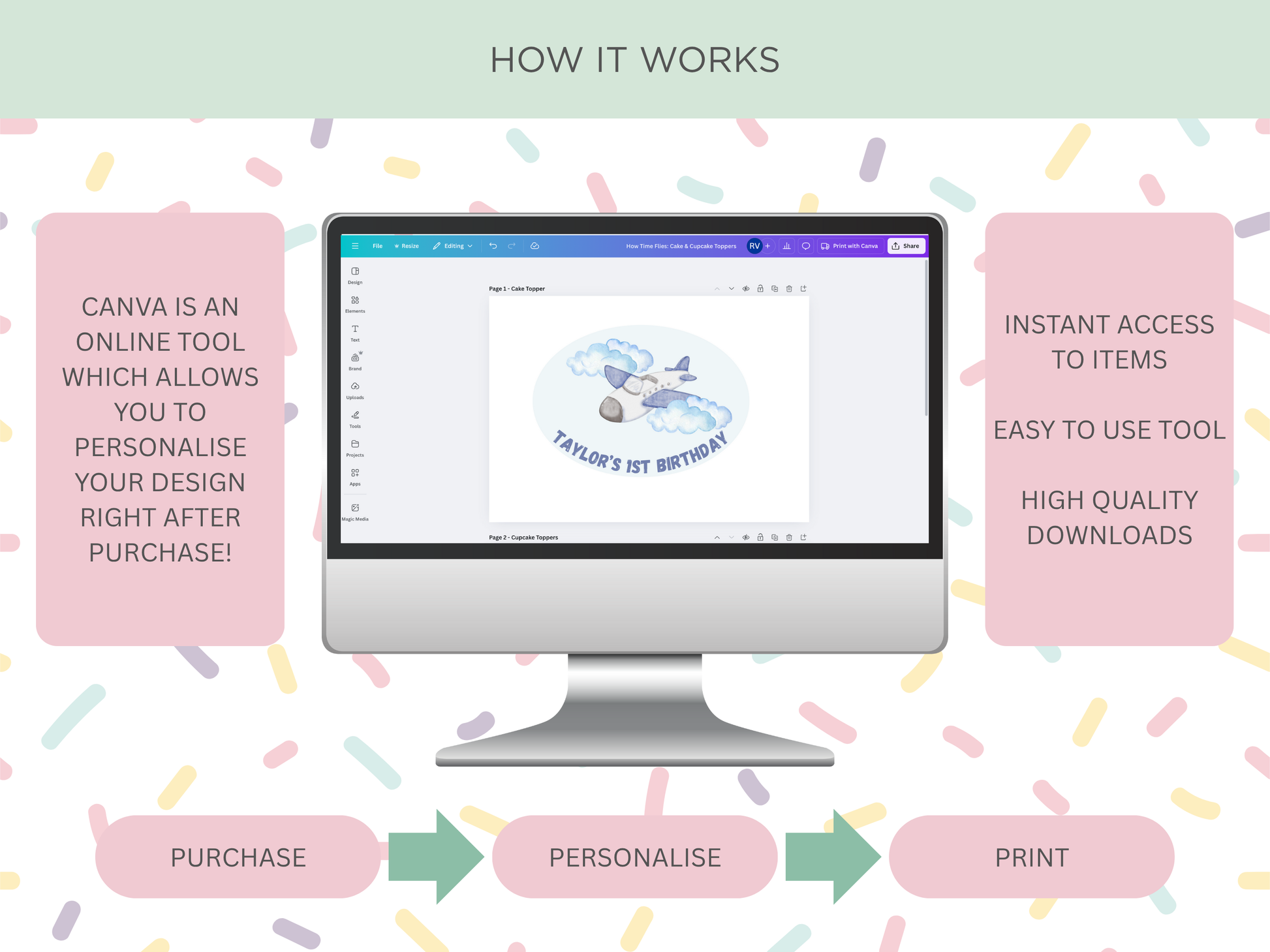 Make your child’s celebration extra special with our fun and vibrant cake and cupcake toppers! This instant download lets you receive the perfect toppers in minutes - right from your phone, tablet, or computer using Canva, a free and easy-to-use online editor.