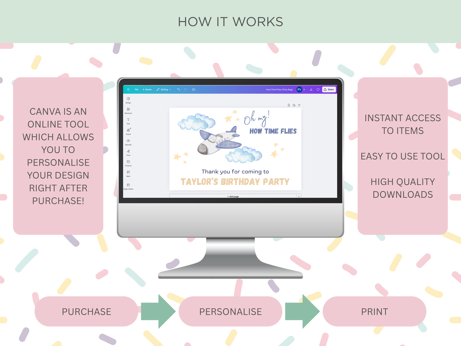 Make your child’s celebration extra special with our fun and vibrant digital party bags! This instant download lets you create the perfect box decoration in minutes - right from your phone, tablet, or computer using Canva, a free and easy-to-use online editor.
